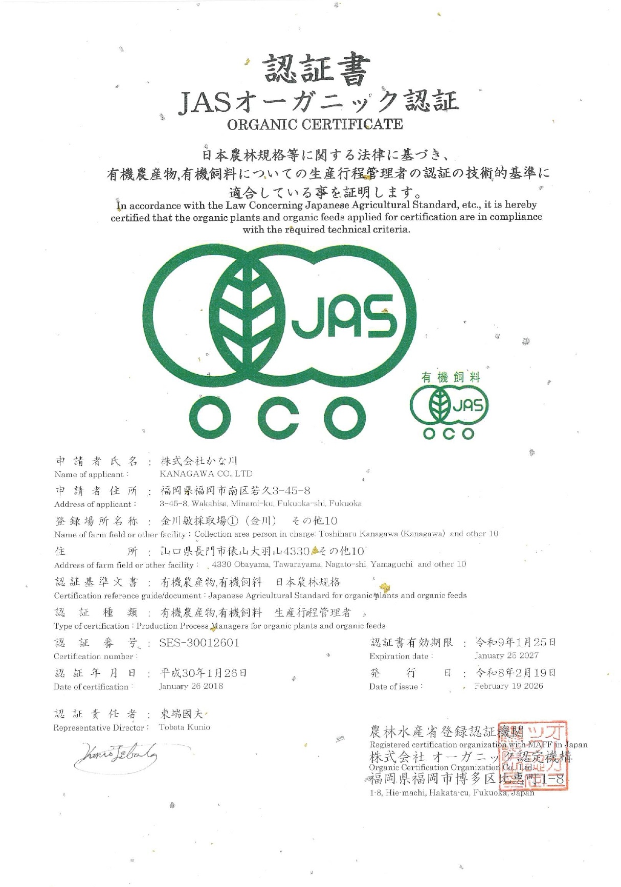 JASオーガニック認定書